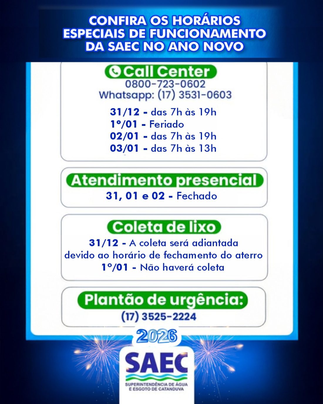 FERIADO DE ANO NOVO – FIQUE ATENTO, ATENDIMENTO DA SAEC TERÁ ALTERAÇÕES