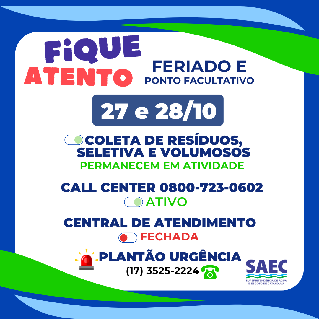 Atenção, contribuintes! Na segunda-feira, dia 27, é ponto facultativo, e na terça, dia 28, Dia do Servidor Público, feriado nas repartições públicas, a Central de Atendimento da Saec estará fechada.