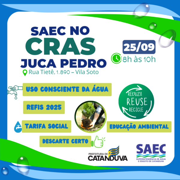 By Karla Sibro23 de setembro de 2025Encontro marcado! 💬 A Saec te convida para o 2º bate-papo de Educação Ambiental, nesta quinta-feira, dia 25, às 8h, no CRAS Juca...