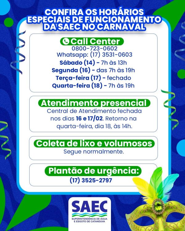 HORÁRIO DE ATENDIMENTO DA SAEC NESTE CARNAVAL