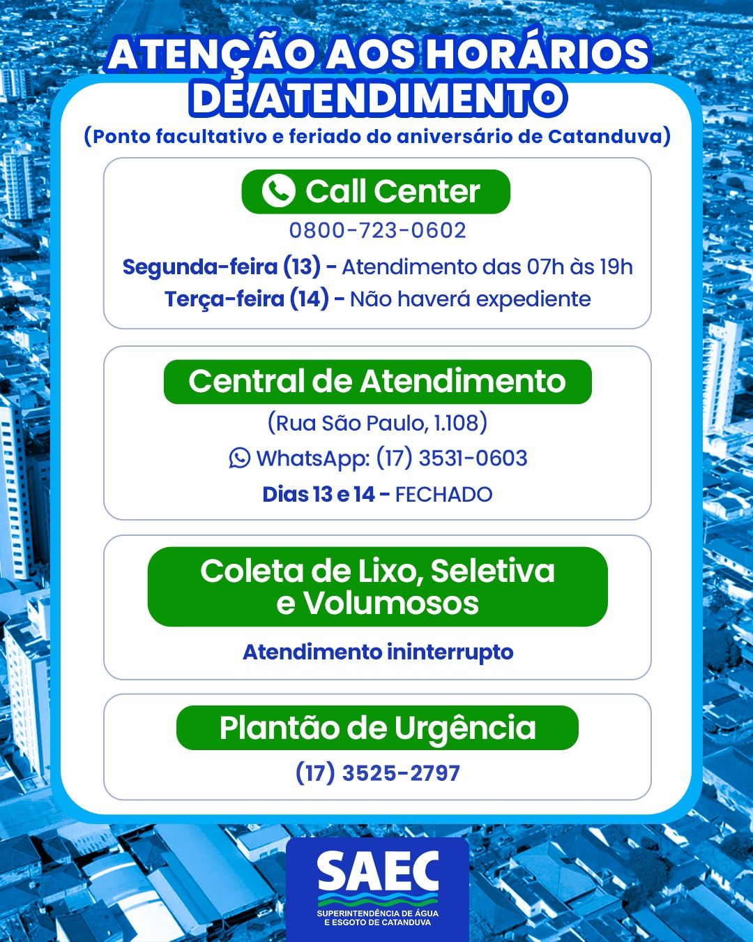Home Destaque Atenção, Catanduva! Confira as mudanças nos horários de atendimento da SAEC