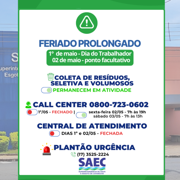 By Karla Sibro30 de abril de 2025Feriadão à vista! Se liga no funcionamento da Saec. Nesta quinta-feira, 1º de maio, é Dia do Trabalhador , e na sexta (2)...