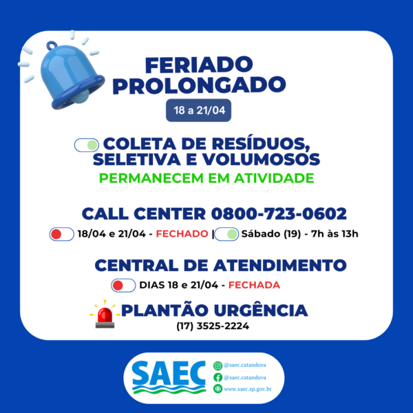 By Karla Sibro20 de abril de 2025Feriadão chegando? A gente segue trabalhando! Fique tranquilo! Durante o feriado prolongado, os serviços da Saec continuam normalmente: Coleta domiciliar de resíduos sólidos...