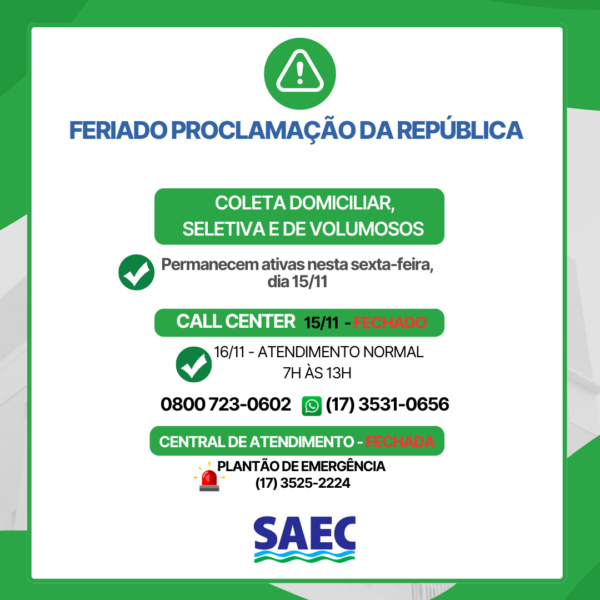 By Karla Sibro18 de novembro de 2024Você sabia que a Saec oferece o serviço de coleta de volumosos? Pois bem, sabe como funciona? Se você tem algum móvel, eletrodoméstico,...
