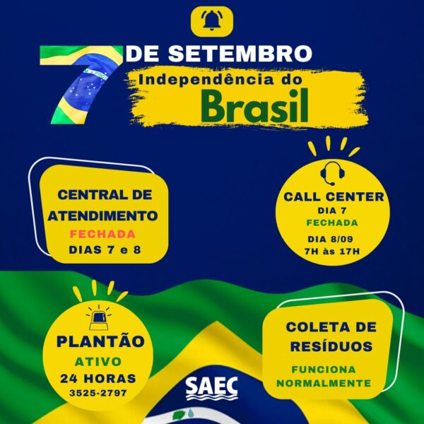 FERIADÃO Vamos patriotizar! Confira como fica os canais de comunicação da SAEC neste feriado prolongado em comemoração a Independência do Brasil! 05-09