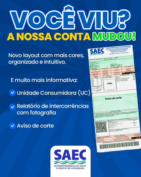 By Karla Sibro16 de dezembro de 2025Mudança para melhor! A Saec apresenta o novo layout da conta de água, esgoto e da tarifa de coleta de resíduos: mais moderna;...