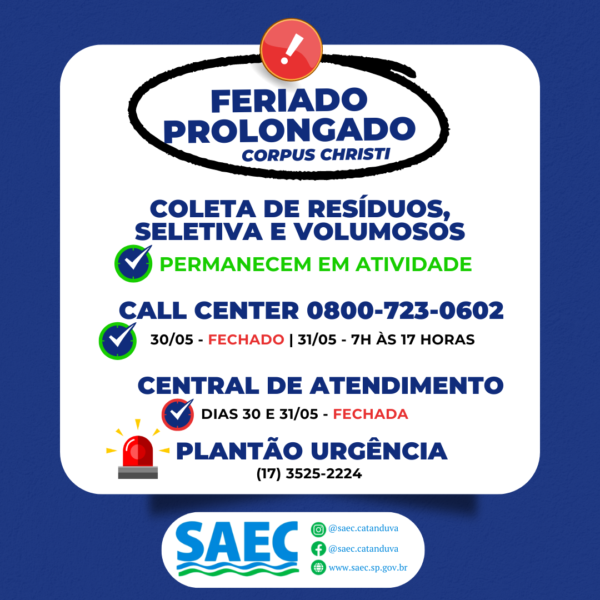 By Karla Sibro31 de maio de 2024Feriado batendo na porta! Confira como fica nossos meios de comunicação neste feriado prolongado nas repartições públicas. Bom feriado a todos!