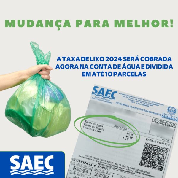 By Karla Sibro2 de março de 2024A partir de agora, a taxa da coleta de resíduos solos, lixo, está inserida na conta de água e dividida em 10 parcelas....