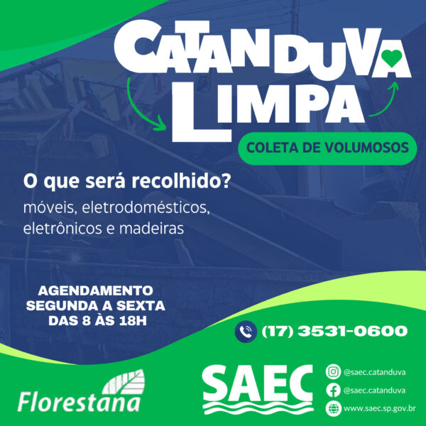By Karla Sibro16 de novembro de 2023Novidade! A partir desta quarta-feira, dia 15, a SAEC assume o serviço de coleta de volumosos do município, antes prestado pela Secretaria Municipal...