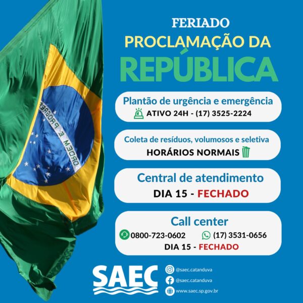 By Karla Sibro16 de novembro de 2023Feriado batendo à porta e a SAEC não para. A coleta de lixo domiciliar, seletiva e a coleta de volumosos funcionarão normalmente. Equipes...
